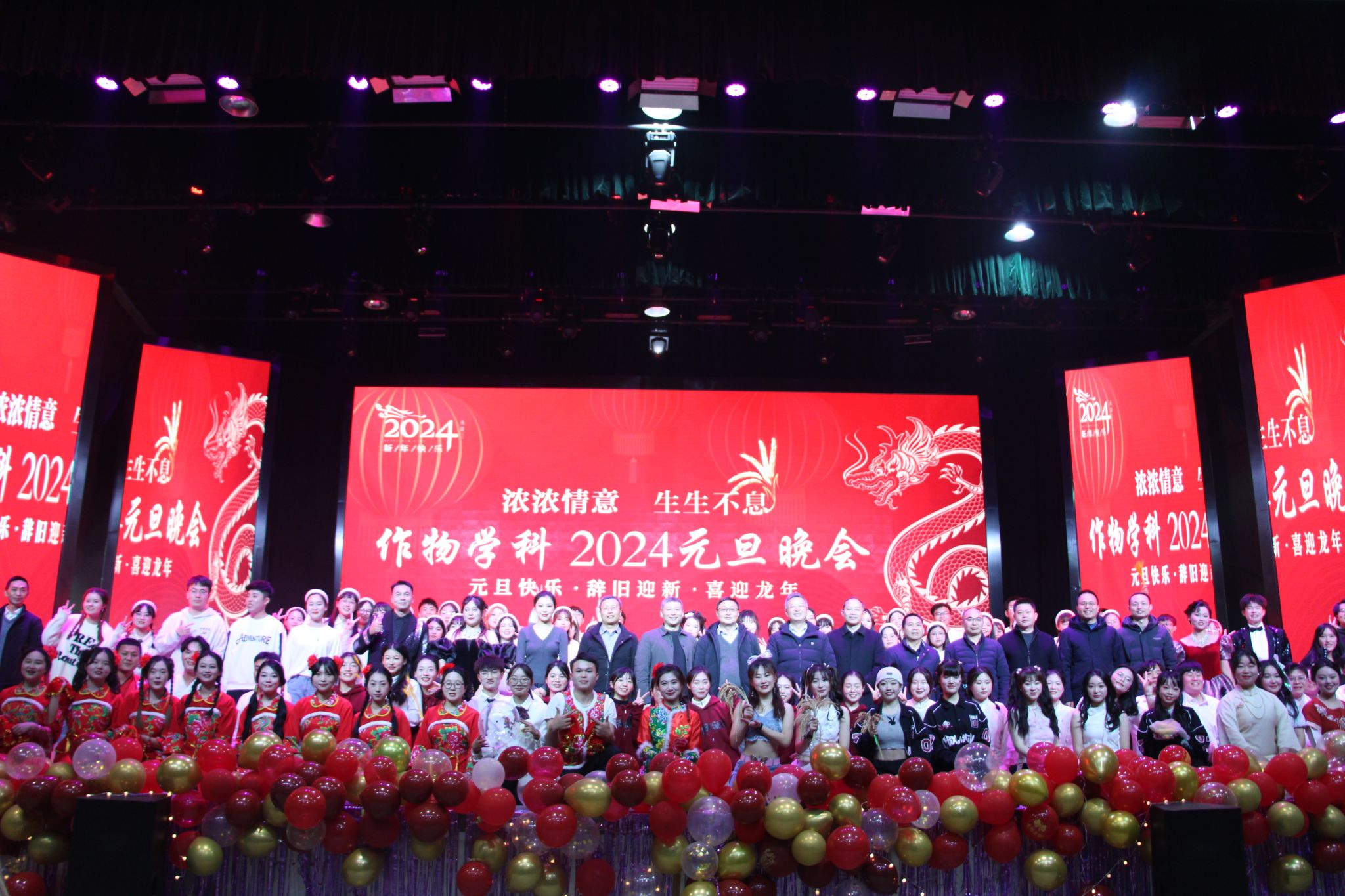 为传承弘扬中华传统优秀文化和作物学科文化,提升师生们对学科的认同感和归属感,营造温馨和谐的校园文化氛围,12月28日晚,“浓浓情意 生生不息”作物学科2024元旦主题联欢晚会在成都校区麦立方隆重举行。研究生工作部部长、研究生院副院长李武生,研究生院副院长康厚扬,农学院副院长杨峰,水稻研究所所长李仕贵、副所长钦鹏、党委副书记李伟滔,小麦研究所所长魏育明、副所长江千涛,玉米研究所所长高世斌、副所长沈亚欧,国家重点实验室主任陈学伟、党委书记任万军、党委副书记戢俊臣等出席晚会。作物学科和来自全校的1500余名师生齐聚一堂,载歌载舞,共迎新年。