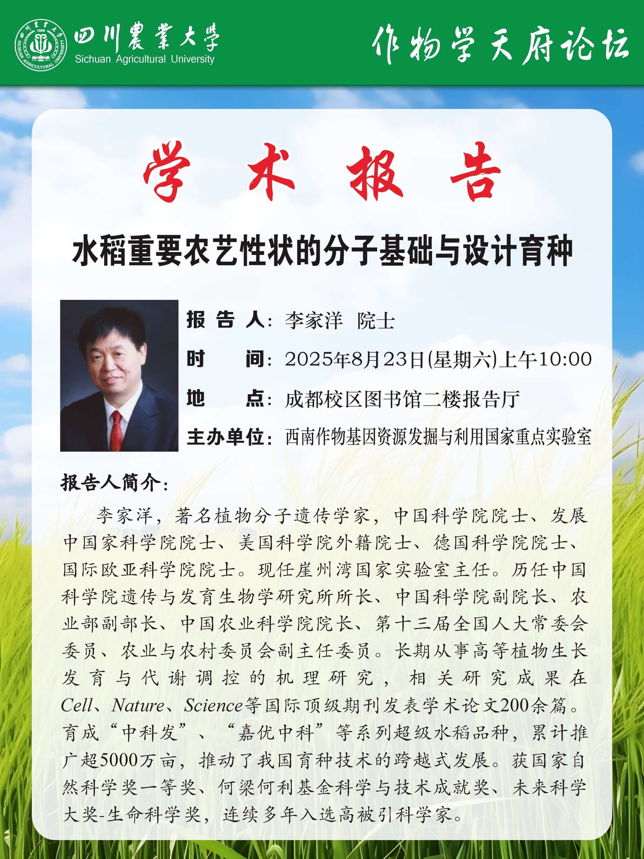 报告题目:水稻重要农艺性状的分子基础与设计育种