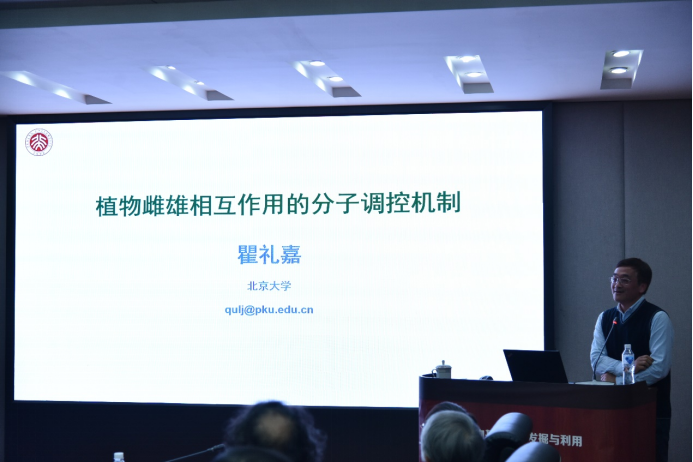 瞿礼嘉从水生植物到陆生植物生殖发育的适应性演化出发,详细讲解了被子植物双受精的生物学现象及其意义。针对双受精过程中雌配子体和雄配子体之间如何相互识别的重要科学问题,他深入浅出地讲解了其带领的团队以拟南芥为研究模式,在被子植物种间遗传隔离、花粉管导向和生长、花粉管维持细胞完整性、精细胞释放等领域取得的系列开拓性发现。这些科学发现深化了受体类激酶、多肽信号及其介导的信号传导在雌-雄配子体以及胚胎发生发育过程中的分子调控机理,极大地推动了对被子植物的有性生殖调控过程的理解。会后,与会师生和瞿礼嘉进行了广泛交流与深入讨论。