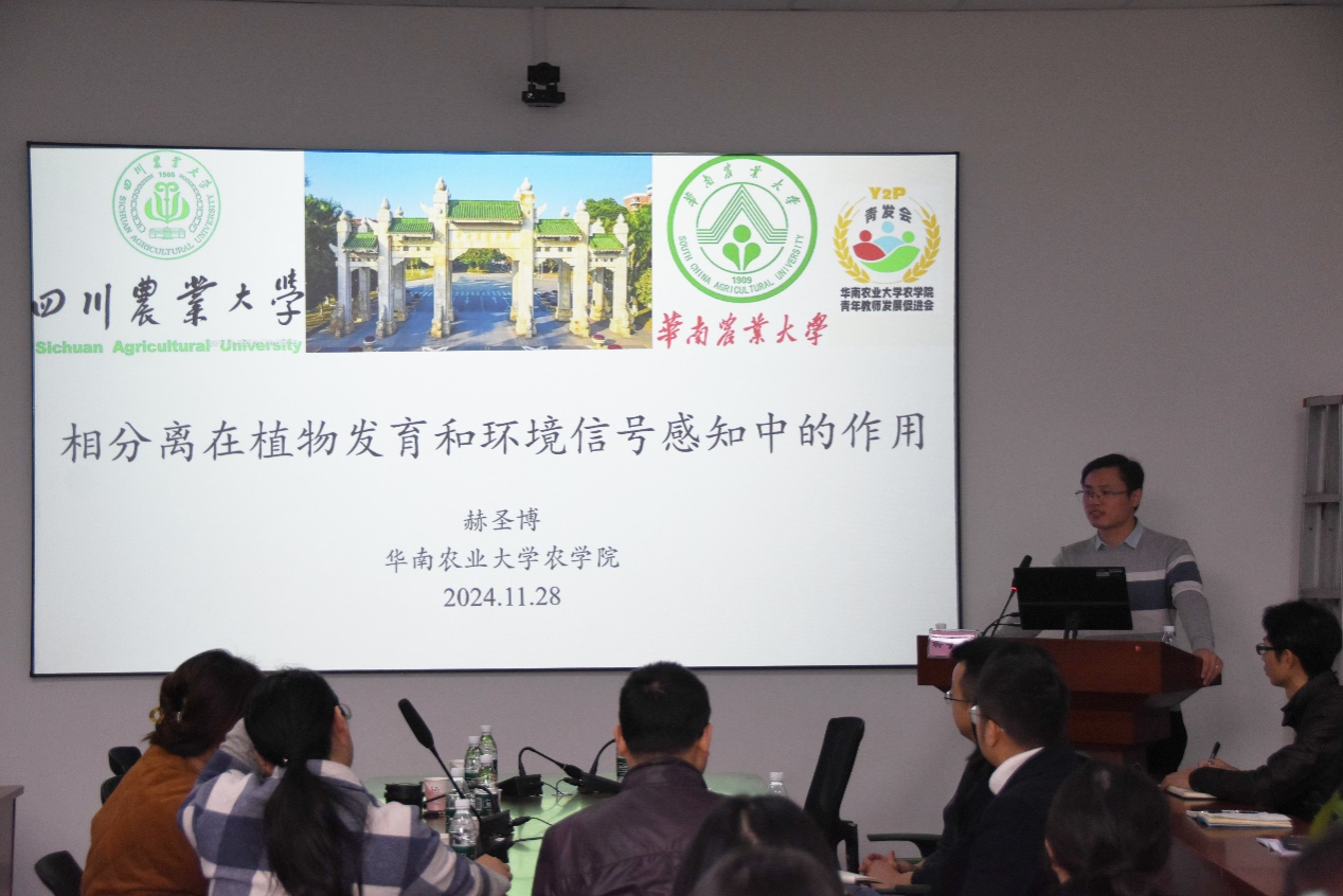 11月27日下午,华南农业大学赫圣博教授应邀来校,在成都校区科技园一期B108会议室,为我校师生带来一场题为“相分离在植物发育和环境感知中的作用”的学术报告。来自国家重点实验室、水稻研究所等作物学科单位的150余名师生聆听了本次报告,报告会由李婷教授主持。