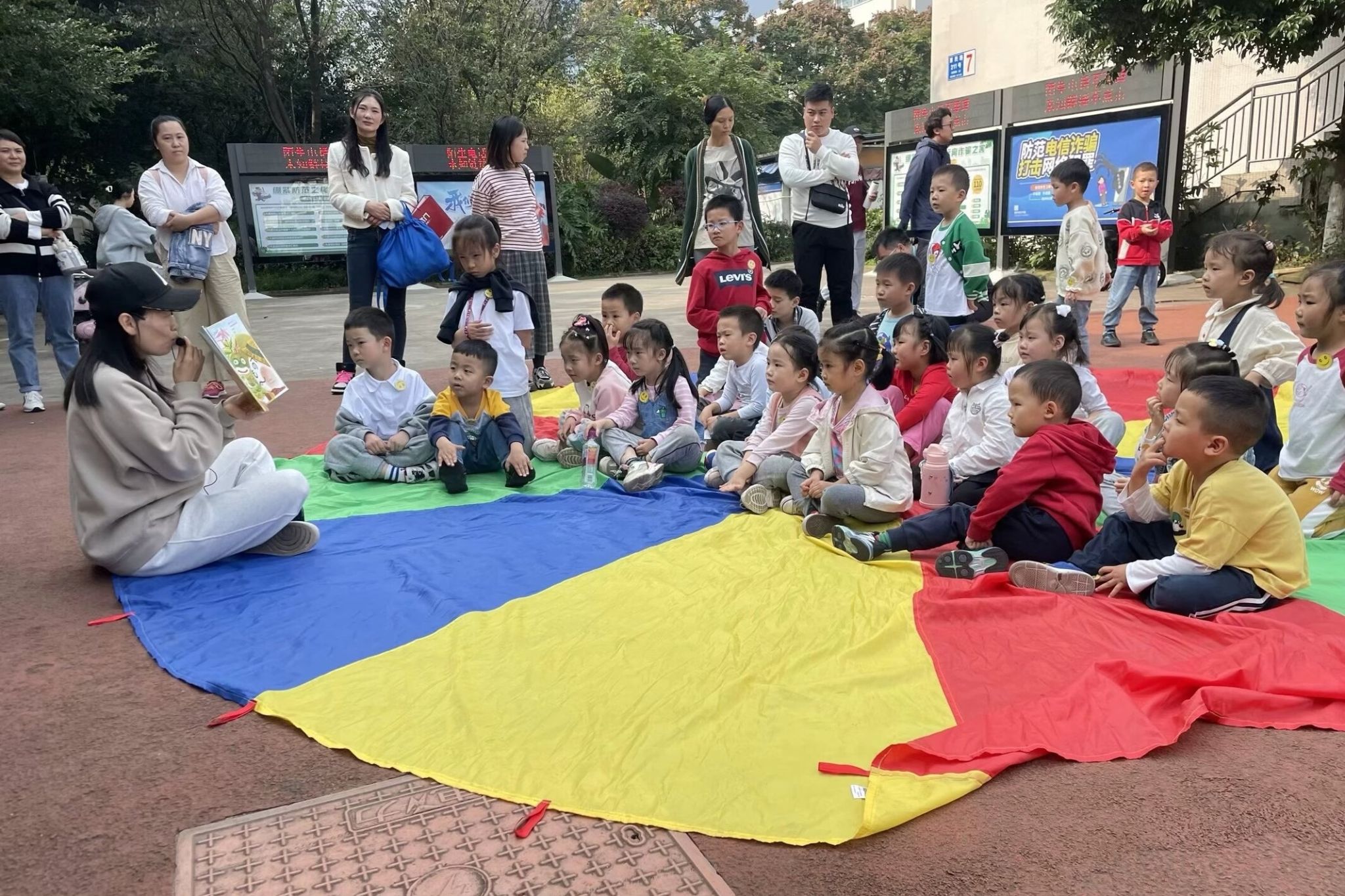 第一站,由志愿者在操场为学生及家长进行绘本分享。绘本为《我们是开心的大米》,以大米的视角进行粮食知识的科普,激发了学生浓厚的兴趣。