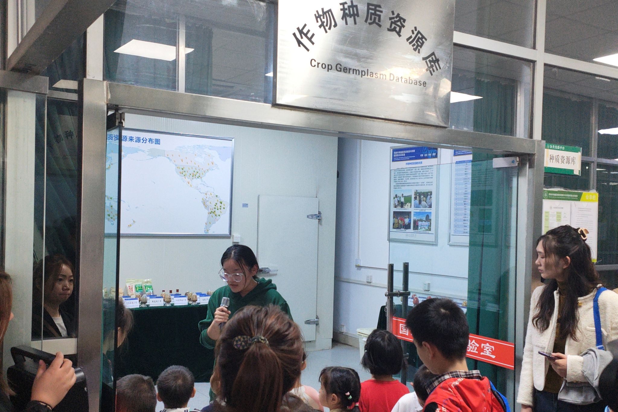 第四站在作物种质资源库。志愿者以资源库丰富的展览品为例,为学生讲解了水稻、小麦和玉米三大农作物品种与培育过程,现场气氛异常活跃。