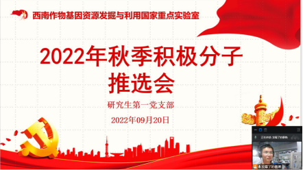 9月20日,西南作物基因资源发掘与利用国家重点实验室研究生第一党支部通过腾讯会议在线召开支部大会,讨论关于2022年度推选入党积极分子问题。支部正式党员、预备党员、发展对象及入党积极分子参加会议,会议由支部副书记李威主持。
