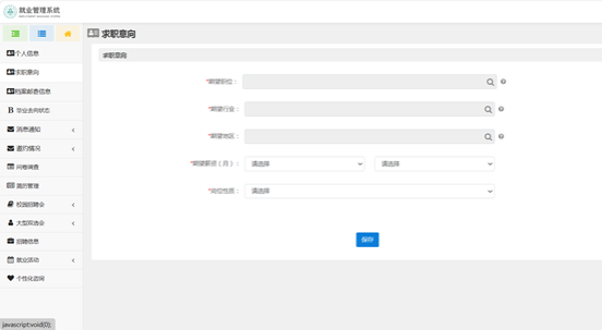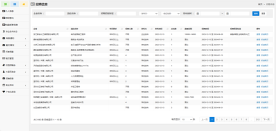 “就业信息网”包含求职意向设定、校园招聘会信息、大型双选会详情以及邀约情况等十三项功能,我校本科生、研究生可登录就业信息网(https://job.sicau.edu.cn/),获取一站式招聘岗位信息。例如“求职意向”功能,毕业生输入期待职位、行业、地区、薪资以及岗位的性质,系统会快速筛选相应岗位并及时推送个人。同时,“招聘信息”“校园招聘会”“大型双选会”三项功能帮助毕业生全面掌握就业信息,有效避免了就业信息的不对称,促进就业信息的共享。另外,毕业生可从平台登录“就业管理系统”,填写个人简历发送给用人单位,办理就业相关业务,极大简化了就业应聘流程。