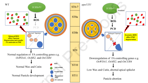 该研究以EMS诱变得到的一份穗顶部小花退化突变体apa1331 (apical panicle abortion1331)为材料,开展了表型鉴定、基因克隆和调控机理的研究。突变体apa1331表现为顶端小穗的退化,无花粉产生及花药角质层缺陷,突变体花药的横切面发现小孢子减数分裂时期开始存在发育缺陷。气相色谱分析表明突变体花药的蜡质和角质层含量明显低于野生型。同时突变体穗顶部活性氧(ROS)和抗氧化剂的稳态遭到破坏,并积累高水平的过氧化氢(H2O2)和丙二醛(MDA)。利用分子克隆技术发现,apa1331是OsSUBSrP1突变导致的,OsSUBSrP1在幼穗顶部高表达。对野生型和突变体小穗6cm时期的穗顶部材料进行转录组数据分析,突变体材料由于OsSUBSrP1基因突变导致蜡质和角质生物合成基因显著下调,最终影响了穗部发育。