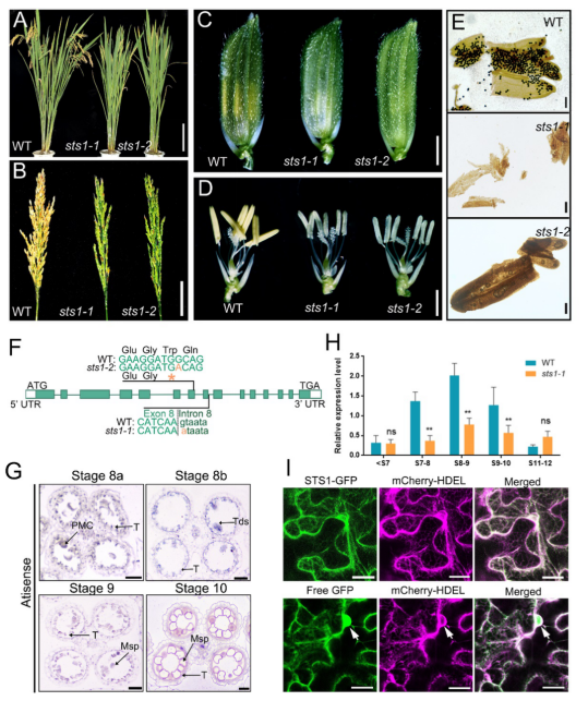 综上,这些结果证实了STS1通过影响绒毡层和花粉壁发育调控雄性生殖的关键作用。该结果同时提示,STS1作为一个脂肪酶,也可能通过与其他相关因子的协同形成代谢区室来参与花药的脂质合成代谢过程。本研究为植物雄性生殖发育及花药脂质代谢的调控机制提供了有价值的新见解,并为新类型杂交水稻不育系培育提供了理论参考和有潜力的基因资源。