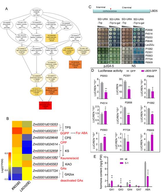 图A. LBD5下游靶基因富集的生物学过程。B. GA和ABA富集通路基因的表达量变化。C.酵母单杂交检测LBD5与下游靶基因启动子的互作。D.荧光素酶活性检测系统分析LBD5与对靶基因启动子的调控。E. ABA和GA含量测定。