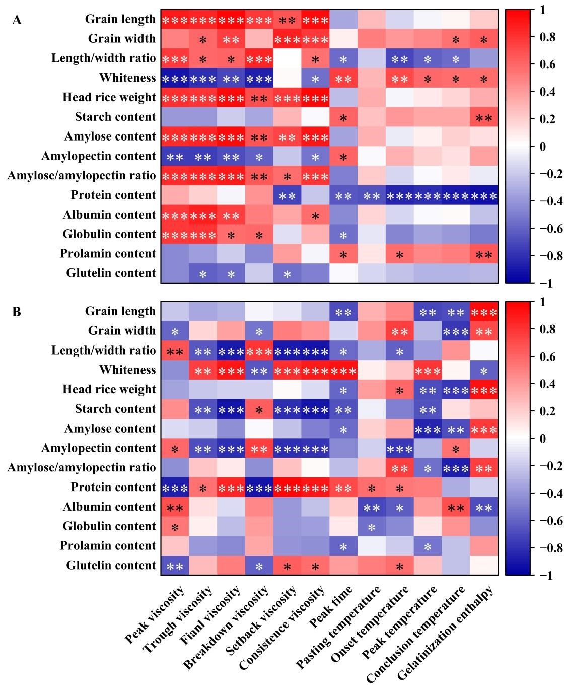 图2不同蛋白质含量水稻品种(A:桂朝II号,B:嘉早311)稻米糊化特性和热特性与稻米外观和组分的相关性