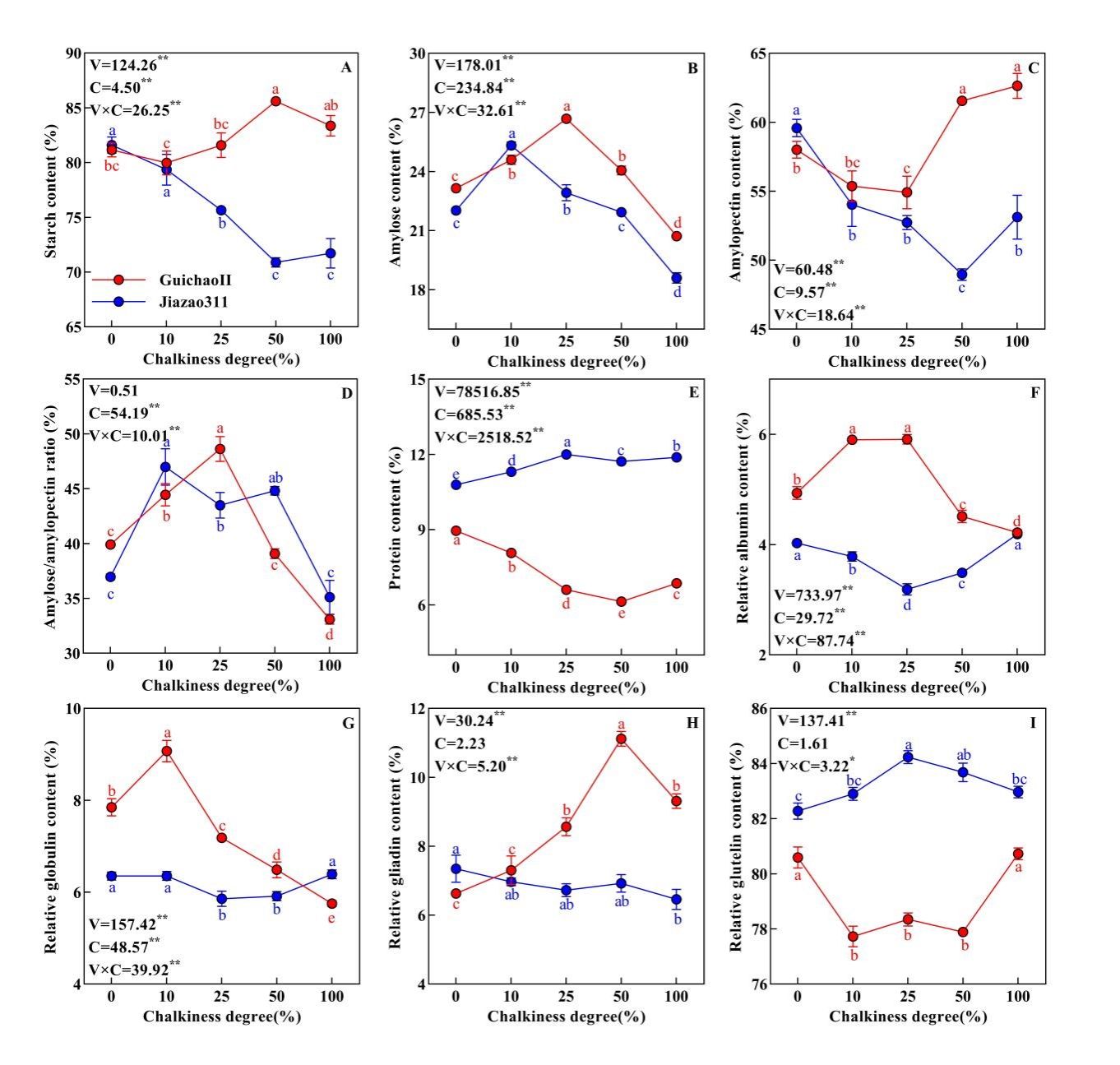仅次于淀粉,蛋白质是稻米的第二大组分,显著影响稻米品质的形成。然而,蛋白质含量与稻米垩白的关系,及其对稻米理化特性的影响仍有待进一步研究。基于此,本研究以桂朝II号(低蛋白质含量品种)和嘉早311(高蛋白质含量品种)的不同垩白稻米(垩白度分别为0、10、25、50和100%)为研究对象,分析了不同垩白米的外观、组分、糊化特性和热特性变化规律。