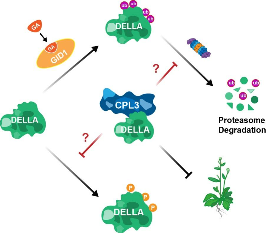 近日,国家重点实验室李婷教授团队联合比利时弗拉芒生物研究中心Yield课题组在New Phytologist(中科院TOP 1区,IF=9.4)在线发表题为“C-TERMINAL DOMAIN PHOSPHATASE-LIKE 3 contributes to GA-mediated growth and flowering by interaction with DELLA proteins”的研究论文。该研究鉴定到一个与DELLA家族RGA和GAI蛋白直接互作的磷酸酶CPL3。发现CPL3通过与RGA和GAI互作,抑制RGA和GAI被26S蛋白酶体降解,进而正调控RGA和GAI蛋白的稳定性(图1)。因此,当拟南芥中CPL3的功能缺失时,植株出现下胚轴伸长、开花时间提前、花色素苷积累降低等表型,类似于GA信号激活的植株表型,转录组分析发现,多个GA响应基因的表达在cpl3突变体中得到激活,表明CPL3负调控GA信号转导途径。该研究揭示了磷酸酶CPL3对GA信号调控的新机制,丰富植物GA信号转导分子机理,为改良农作物生长发育提高产量和品质提供新的理论指导。