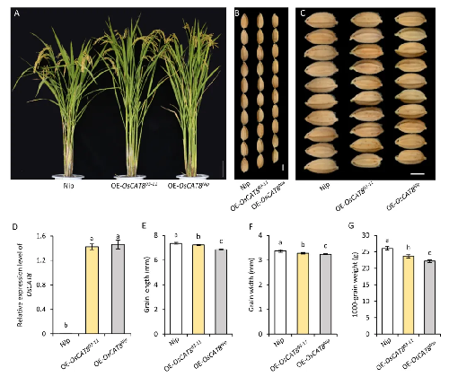 研究者发现,CSSL9-17与受体亲本93-11相比,籽粒变小和粒重降低(图1)。进一步遗传分析和基因定位发现,在水稻11号染色体有两个位点共同影响千粒重,命名为qGW11a和qGW11b,两个位点对千粒重的影响具有叠加效应。对效应更大的qGW11a位点进行候选基因分析发现,定位区间内存在一个编码氨基酸通透酶的基因OsCAT8,该基因在亲本启动子和编码区都存在较大序列差异。通过转基因验证发现,过表达OsCAT8籽粒变小,粒重下降(图2);而OsCAT8敲除株系籽粒变长,粒重增加(图3),表明OsCAT8是水稻粒型和粒重的负调控因子。与等位基因OsCAT8Nip相比,OsCAT893-11启动子区存在287-bp插入,导致OsCAT893-11启动子活性降低,从而降低其表达量使水稻籽粒变大。基因分型发现,该287-bp插入仅存在于少量籼稻、野生稻和中间型品种,粳稻中几乎不存在该位点(图4)。表明大粒型的OsCAT893-11具有重要的育种应用潜力,该位点的发现也为OsCAT8后续的育种利用提供了准确的分子标记。