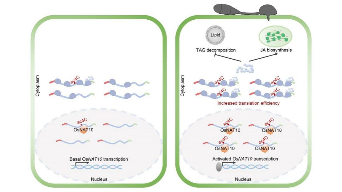 稻瘟病等病害严重危害水稻的安全生产。水稻重大病害抗性团队一直致力于阐明水稻重大病害抗性调控的分子机制,取得了系列重要进展(Cell, 2017;Science, 2018;Nature Microbiology, 2020; Nature Communications, 2023等)。为揭示RNA修饰在转录后重编程中的关键作用,该团队在本研究中系统性的鉴定了稻瘟菌侵染前后翻译重编程mRNA和6种主要RNA修饰(m1A、2’O-Nm、ac4C、m5C、m6A、m7G)的差异修饰位点。相关性分析表明,具有RNA修饰的mRNA比不具有RNA修饰的mRNA展现更高的丰度和翻译效率。聚类分析表明,在稻瘟病侵染后,生长发育进程相关基因的mRNA翻译效率显著降低,免疫信号通路相关基因的mRNA翻译效率显著增强。更为重要的是,该团队发现稻瘟病侵染时,RNA乙酰化修饰动态和mRNA翻译重编程显著正相关。深入分析表明,富集于密码子第三位的RNA乙酰化修饰(ac4C)增强了脂质代谢和茉莉酸合成相关mRNA的翻译效率。RNA乙酰基转移酶OsNAT10作为调控RNA乙酰化修饰的关键因子,参与调控水稻抗病性。在OsNAT10敲除突变体中,水稻体内mRNA乙酰化水平显著降低,茉莉酸合成受阻,植株对稻瘟病的抗性降低。该研究为通过表观重编程提高作物抗病性提供了新的基因资源,并为阐明RNA修饰平衡水稻产量和抗性的分子机理奠定了坚实基础。