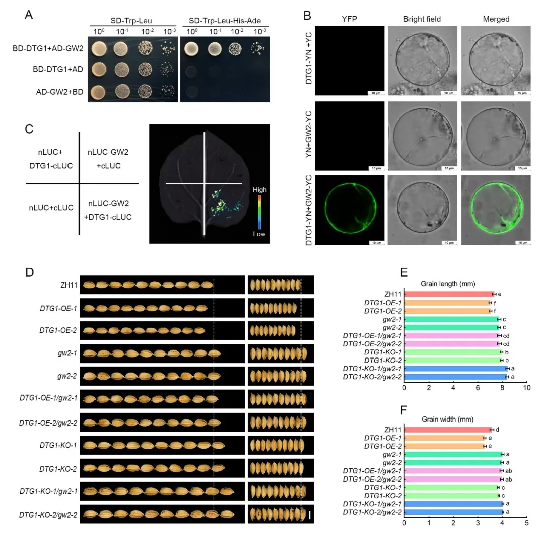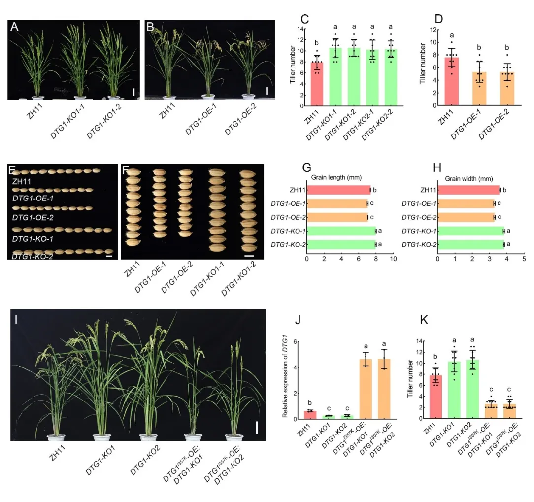 研究者前期在籼稻G630和粳稻02428花药离体培养后代材料中鉴定到一份分蘖显著减少的突变体dtg1(defective tiller growth 1),利用粳稻02428为轮回亲本构建近等基因系,通过QTL-seq结合图位克隆方法鉴定到了调控水稻分蘖和粒型的基因DTG1,该基因编码水稻I型酪蛋白激酶(图1);遗传学分析表明,DTG1负调控水稻分蘖数和籽粒大小,而来源于dtg1突变体的DTG1I357K等位变异增强了该基因抑制水稻分蘖方面的功能,从而引起少分蘖表型(图2);蛋白互作和遗传分析表明,DTG1与粒型调节关键因子GW2互作,作用于GW2上游协同调控水稻籽粒大小(图3);利用CRISPR/ Cas9基因编辑技术对粳稻品种02428中的DTG1基因进行改良,发现敲除DTG1的改良株系有效分蘖和千粒重显著增加(图4),产量提升6.8%~9.3%,将为水稻高产育种提供新的基因资源。