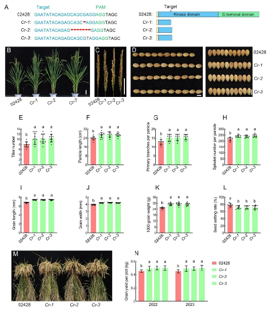 水稻是重要的粮食作物之一,有效分蘖数和籽粒大小是决定水稻产量的关键农艺性状。尽管近年来对水稻分蘖和籽粒大小的遗传机制进行了广泛研究,但可供育种应用的基因资源仍相当有限。I型酪蛋白激酶是一种在真核生物中普遍存在且高度保守的蛋白激酶,在植物中参与调节多种生理和信号转导过程,但该类激酶在作物关键农艺性状方面的调控功能及作用机制目前尚不明确。