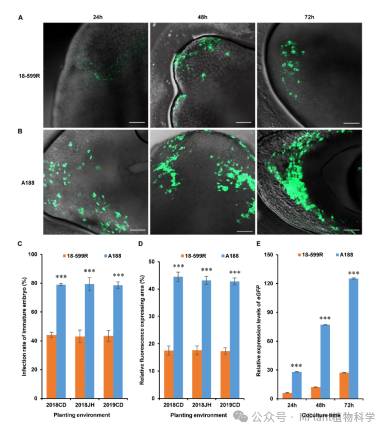 图1 利用自主研发的表型评价方法精准定量玉米18-599R和A188自交系幼胚的农杆菌侵染频率