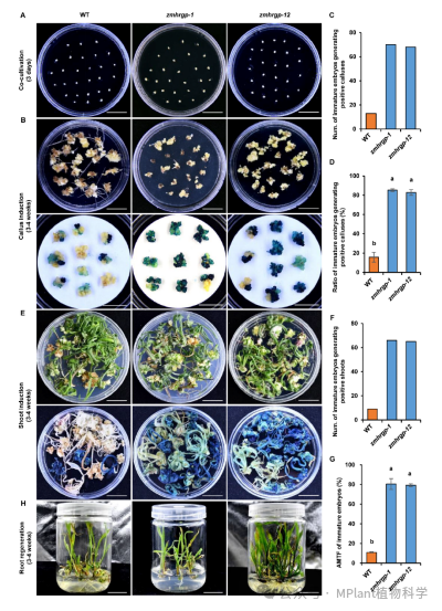 利用CRISPR/Cas9系统在低AIF自交系18-599R中敲除ZmHRGP基因,大幅度提高了农杆菌侵染效率(图3)。另外,基于ZmHRGP敲除材料,本研究建立了农杆菌介导的高效遗传转化体系,幼胚转化率由11%提高至80%(图4)。同时,本研究还利用RNAi抑制ZmHRGP表达,验证了瞬时抑制ZmHRGP表达也可显著提升玉米愈伤组织和叶片的农杆菌侵染效率。