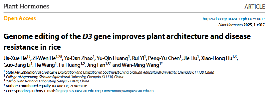 独角金内酯(Strigolactone,SL)已被证实可通过调控水稻茎秆伸长与分蘖角度影响株型建成,并在生物/非生物胁迫响应中具有感知功能。其中,编码F-box蛋白的D3基因作为SL信号通路的核心组分,其功能缺失突变体表现为株高显著降低、分蘖数增加的典型表型,因此可作为遗传改良水稻株型的分子靶标。2025年8月,Plant Hormones期刊在线发表了tyc5997太阳集团西南作物基因资源发掘与利用国家重点实验室王文明教授团队题为Genome editing of the D3 gene improves plant architectureand disease resistance in rice的研究论文。该研究发现通过编辑D3基因改良水稻株型的同时提高了水稻对白叶枯病的抗性。