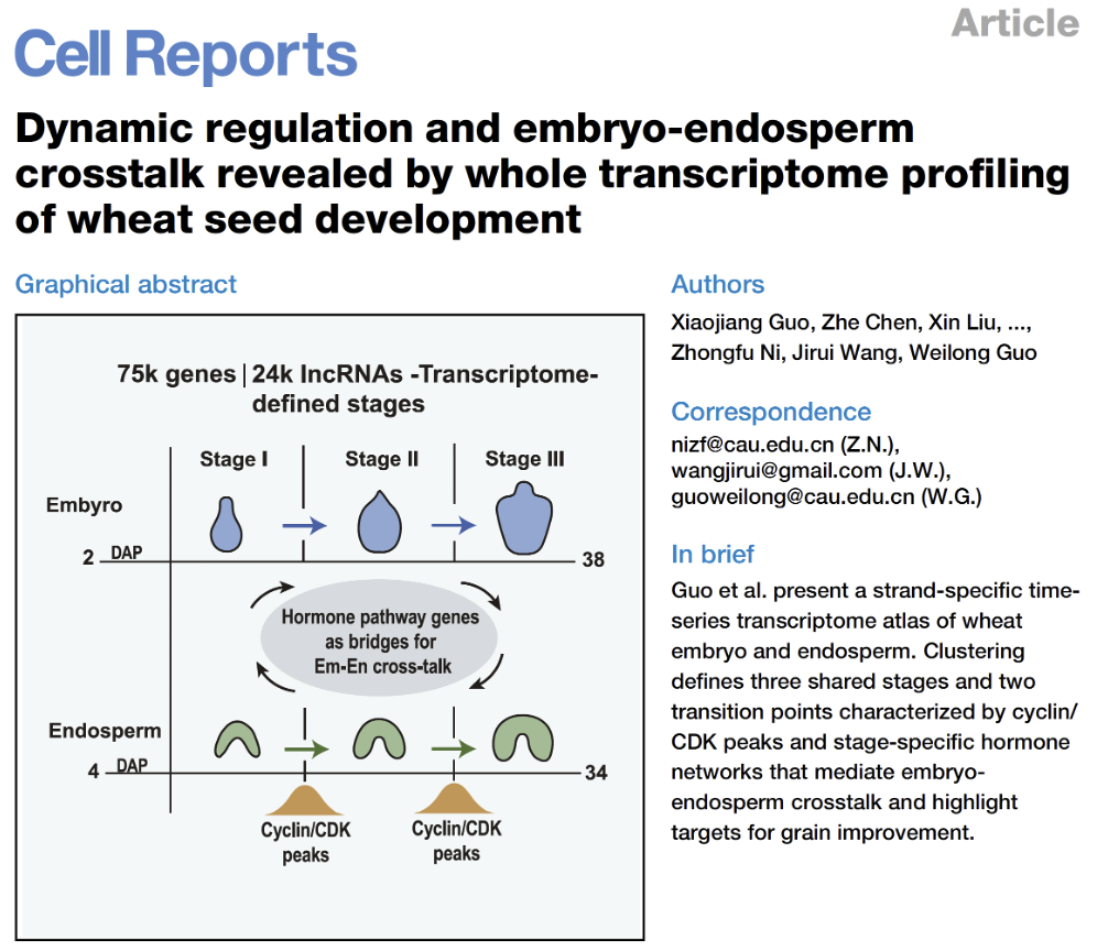 近日,中国农业大学小麦研究中心孙其信院士团队与tyc5997太阳集团国家重点实验室王际睿教授团队合作,在Cell Reports发表了题为“Dynamic Regulation and Embryo-Endosperm Cross-Talk Revealed by Whole-Transcriptome Profiling of Wheat Seed Development”的研究论文。该研究构建了小麦胚与胚乳在发育过程中的高分辨率时序转录组图谱。通过链特异性RNA测序,系统解析了两者的转录动态及互作规律。通过分析基因与长非编码RNA(lncRNA)的组织与时期特异性表达,鉴定了胚与胚乳在发育过程中的关键阶段及其转录特征。通过构建共表达网络并结合关键发育转换期的转录动态,揭示了驱动发育进程的调控模块与核心转录本。此外,该研究在转录水平解析了种子发育过程中胚与胚乳间协同调控的规律。该研究首次在全转录组水平系统揭示了小麦胚与胚乳发育过程中转录调控与组织协调发育的规律,为作物种子建成机制解析提供了关键数据资源与理论依据。研究发掘的关键基因与非编码RNA可为小麦遗传改良提供了潜在靶点,对提升种子活力、产量与品质、保障粮食安全具有重要价值。