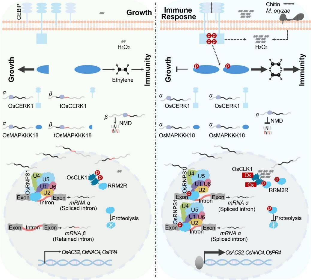 该研究发现,过氧化氢(H₂O₂)触发的RNA结合蛋白RRM2R磷酸化,可解除OsMAPKKK18基因中“滞留内含子刹车”,从而调控水稻的免疫与生长平衡。在稳态条件下,内含子驻留转录本OsMAPKKK18β会通过无义介导的mRNA降解(NMD)途径被清除,这一过程有利于水稻生长。当稻瘟病菌侵染时,H₂O₂会激活蛋白激酶OsCLK1,使其磷酸化并稳定RRM2R蛋白;稳定后的RRM2R与OsRNPS1A/B相互作用,招募剪接体复合物,进而促进OsMAPKKK18的驻留内含子剪接,产生不含驻留内含子的转录本OsMAPKKK18α,以增强水稻的抗病性。当诱导产生的H₂O₂在免疫反应中消耗或降解后,RRM2R蛋白丰度降低,导致OsMAPKKK18α转录本积累减少,从而避免水稻发生自身免疫反应。这一“氧化信号-基因剪接-免疫激活”的分子机制,揭示了水稻如何通过动态调控RNA可变剪接平衡水稻抗病与生长,为精准培育“高产抗逆”水稻品种提供了核心理论支撑与基因靶点。