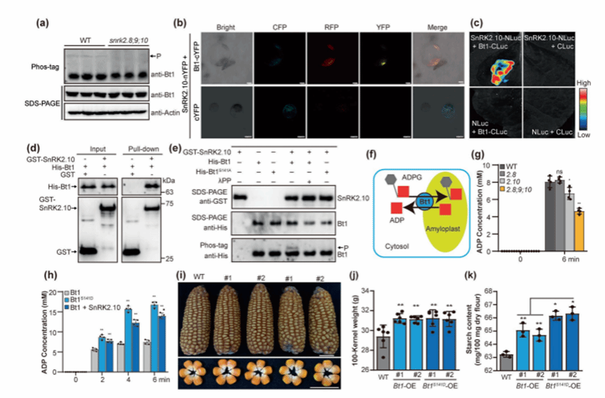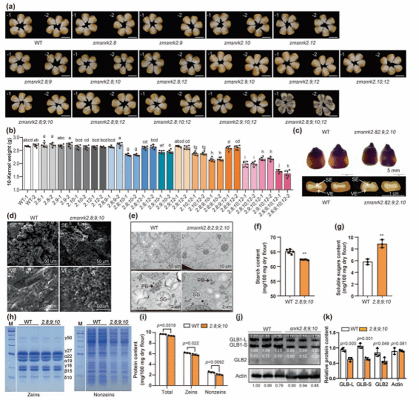 近日,Plant Biotechnology Journal杂志在线发表了由tyc5997太阳集团黄玉碧/李炀平课题组及其合作团队撰写的“Subclass III SnRK2 kinases coordinate starch and storage protein synthesis during maize kernel development”研究论文。该研究系统揭示了玉米SnRK2-III亚类成员(ZmSnRK2.8/2.9/2.10/2.12)协同调控籽粒淀粉与储藏蛋白合成的功能及机制,并评估了其在同步提升玉米产量和品质方面的育种应用潜力,为玉米高产优质分子设计育种提供了重要理论依据与潜在基因资源。